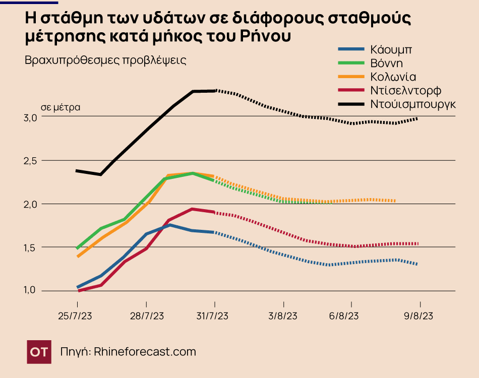 Τα επίπεδα του νερού στον ποταμό είχαν υποχωρήσει στα 1,6 μέτρα την περασμένη εβδομάδα μετά τις υψηλές θερμοκρασίες ρεκόρ που καταγράφονταν στην Ευρώπη. Οι υπηρεσίες διαχείρισης του ποταμού χτυπούν το καμπανάκι του κινδύνου για τη στάθμη όταν αυτή πέφτει κάτω από τα 2,1 μέτρα. Τότε τα πλοία μπορούν να μεταφέρουν μόνο το 50% με 60% της χωρητικότητάς τους. Για κάθε μείωση της στάθμης κατά 10 εκατοστά του μέτρου, κάθε πλοίο μπορεί να μεταφέρει 100 τόνους λιγότερους σύμφωνα με στελέχη της εταιρείας Swiss Rhine Ports που μίλησαν στο Bloomberg.