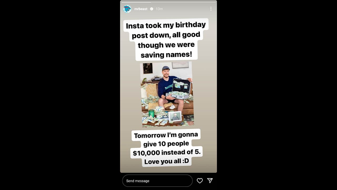ξεκίνησε έναν τεράστιο διαγωνισμό στο Instagram. Συγκεκριμένα, ο πασίγνωστος YouTuber ανακοίνωσε πως θα χάριζε 10.000 δολάρια σε πέντε τυχερούς followers που θα έκαναν share τη δημοσίευσή του στο story τους και tag κάποιον στα σχόλια.