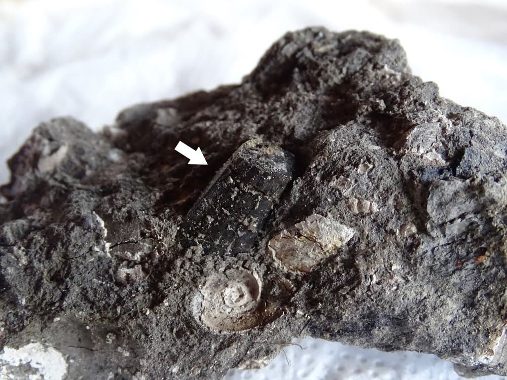 Ένα μερικώς διατηρημένο δόντι κροκόδειλου, ακόμα εγκλωβισμένο σε μια μήτρα βράχου, που ανακαλύφθηκε από την επίκουρη καθηγήτρια Ralitsa Bogdanova του Εθνικού Μουσείου Φυσικής Ιστορίας. Φωτογραφία μέσω της σελίδας του Εθνικού Μουσείου Φυσικής Ιστορίας της Βουλγαρίας στο Facebook/