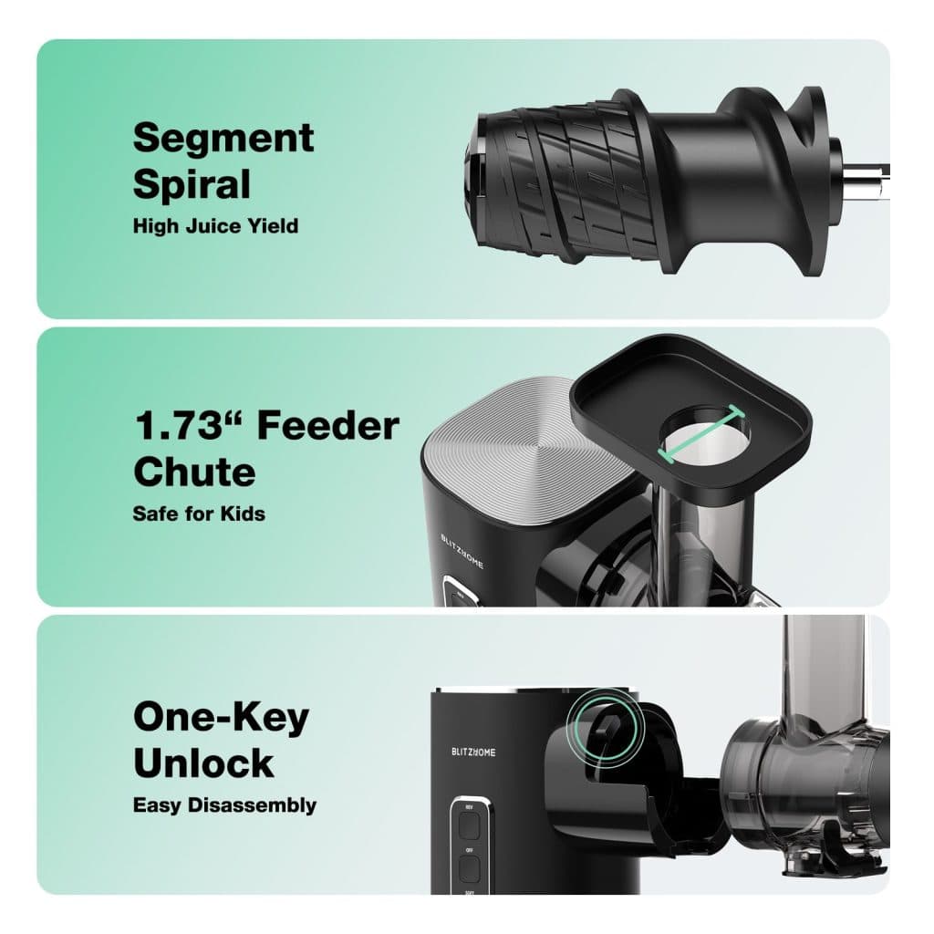 Με μοτέρ 150W, ο αποχυμωτής της BlitzHome χρησιμοποιεί αργή σύνθλιψη για να σας προσφέρει χυμούς απο φρούτα και λαχανικά που σε άλλη περίπτωση δε θα μπορούσατε με τίποτα να ξεζουμίσετε.
