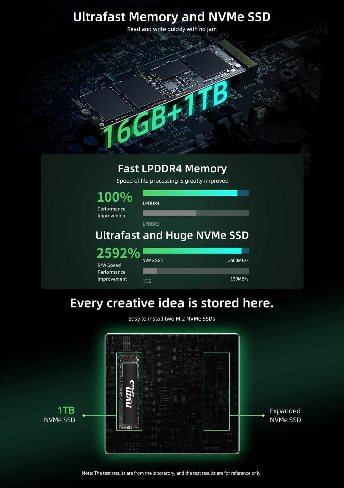 Απο πλευράς μνήμης, θα βρείτε 16GB LPDDR4 RAM ενώ προεγκατεστημένο θα βρείτε και έναν NVMe SSD 1ΤB που μπορεί να χωρέσει το λειτουργικό σας, τα αρχεία σας, τις φωτογραφίες σας, τα βίντεο σας, “τα βίντεο σας” γενικά ότι χρειάζεται να αποθηκεύσετε.