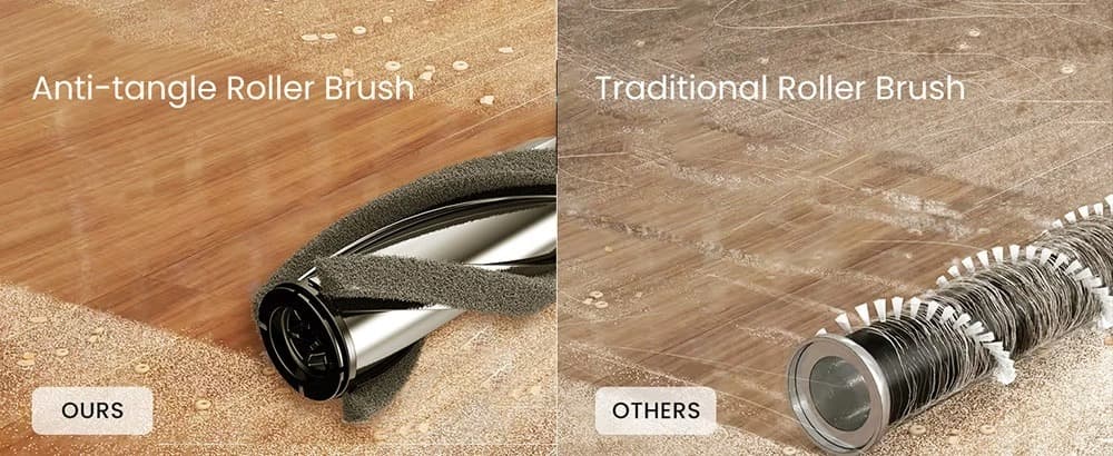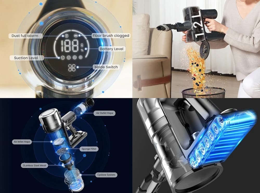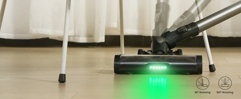 Η Proscenic P12 ειδική βούρτσα, για να ξεμπλέξετε εύκολα τα σκουπίδια που μπορεί να μπλέξουν εκει κατα τη χρήση, και έχει ένα “κέντρο ελέγχου” στο χερούλι του , που σας δίνει πληροφορίες για τη στάθμη της μπαταρίας, την επιλεγμένη ταχύτητα, και έχει και τρία λαμπάκια σφαλμάτων, που σας ειδοποιούν για γεμάτο κάδο, ή σκουπίδια στο σημείο εισόδου.