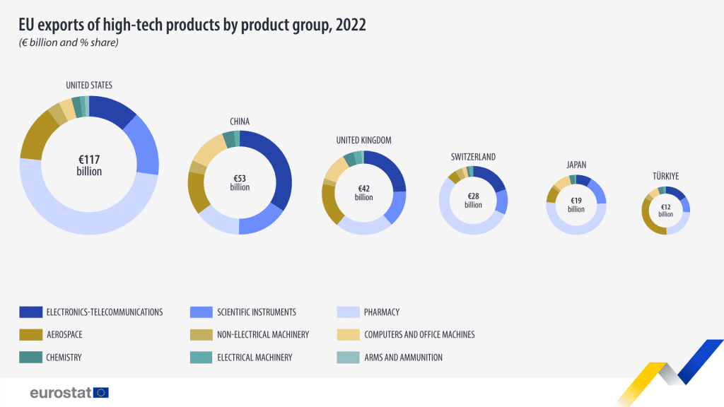 Όσον αφορά στις εξαγωγές υψηλής τεχνολογίας σε χώρες εκτός ΕΕ, οι Ηνωμένες Πολιτείες ήταν ο κορυφαίος εμπορικός εταίρος το 2022 (26% και 118 δισεκατομμύρια €) ενώ έπονται Κίνα (12% και 53 δισεκατομμύρια €), Ηνωμένο Βασίλειο (9% και 42 δισεκατομμύρια €), Ελβετία (6% και 28 δισεκατομμύρια €), Ιαπωνία (4% και 19 δισεκατομμύρια €) και Τουρκία (3% και 12 δισεκατομμύρια €).