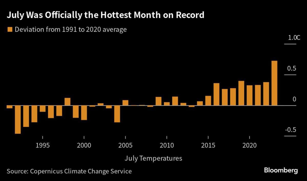 Δεν είχε τόσο ζέστη ακόμα κι αν συνδυάσουμε τα αρχεία παρατηρήσεων και τα παλαιοκλιματικά αρχεία για τα τελευταία 120.000 χρόνια. Η παγκόσμια μέση θερμοκρασία για τον Ιούλιο του 2023 επιβεβαιώθηκε πως ήταν η υψηλότερη στα αρχεία για οποιονδήποτε μήνα. Υπολογίζεται πως είναι 1.5 βαθμό θερμότερο από το μέσο όρο του 1850-1900.