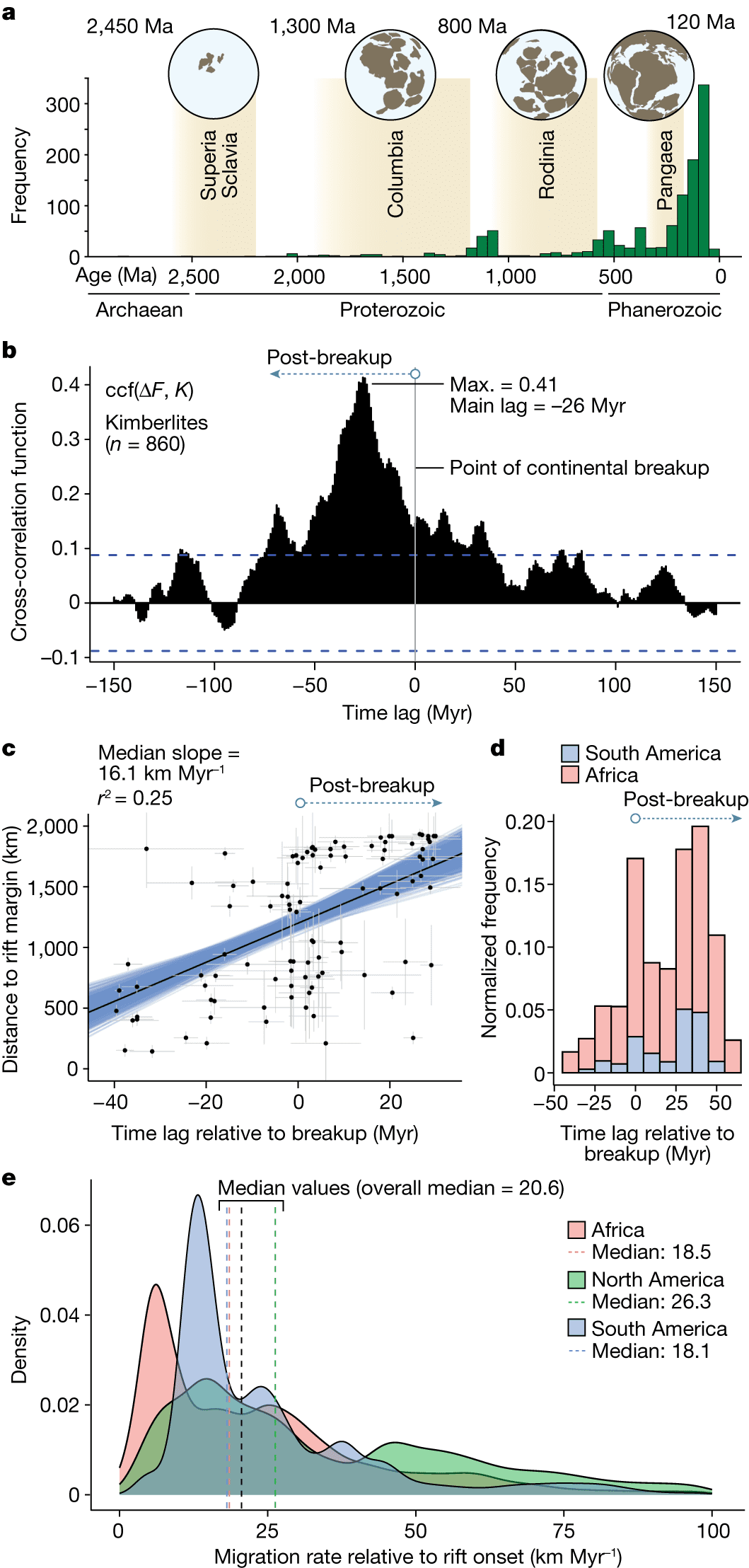 Μία στατιστική ανάλυση με χρήση AI έδειξε πως οι εκρήξεις των περισσότερων ηφαιστείων κιμπερλίτη έλαβαν χώρα 20 με 30 εκατομμύρια χρόνια μετά τον τεκτονικό διαχωρισμό των ηπείρων της Γης. Επιπλέον, μία μελέτη των τριών ηπείρων όπου βρίσκουμε τους περισσότερους κιμπερλίτες, Αφρική, Νότια και Βόρεια Αμερική, υποστηρίζει αυτά τα ευρήματα. Υπολογιστικά μοντέλα δείχνουν πως υπάρχει ένα εφέ ντόμινο στη δημιουργία μάγματος κιμπερλίτη όταν διαχωρίζονται οι ήπειροι. Κατά τη μετακίνηση, μία περιοχή κάτω από τις ηπείρους βυθίζεται μέσα στο μανδύα.