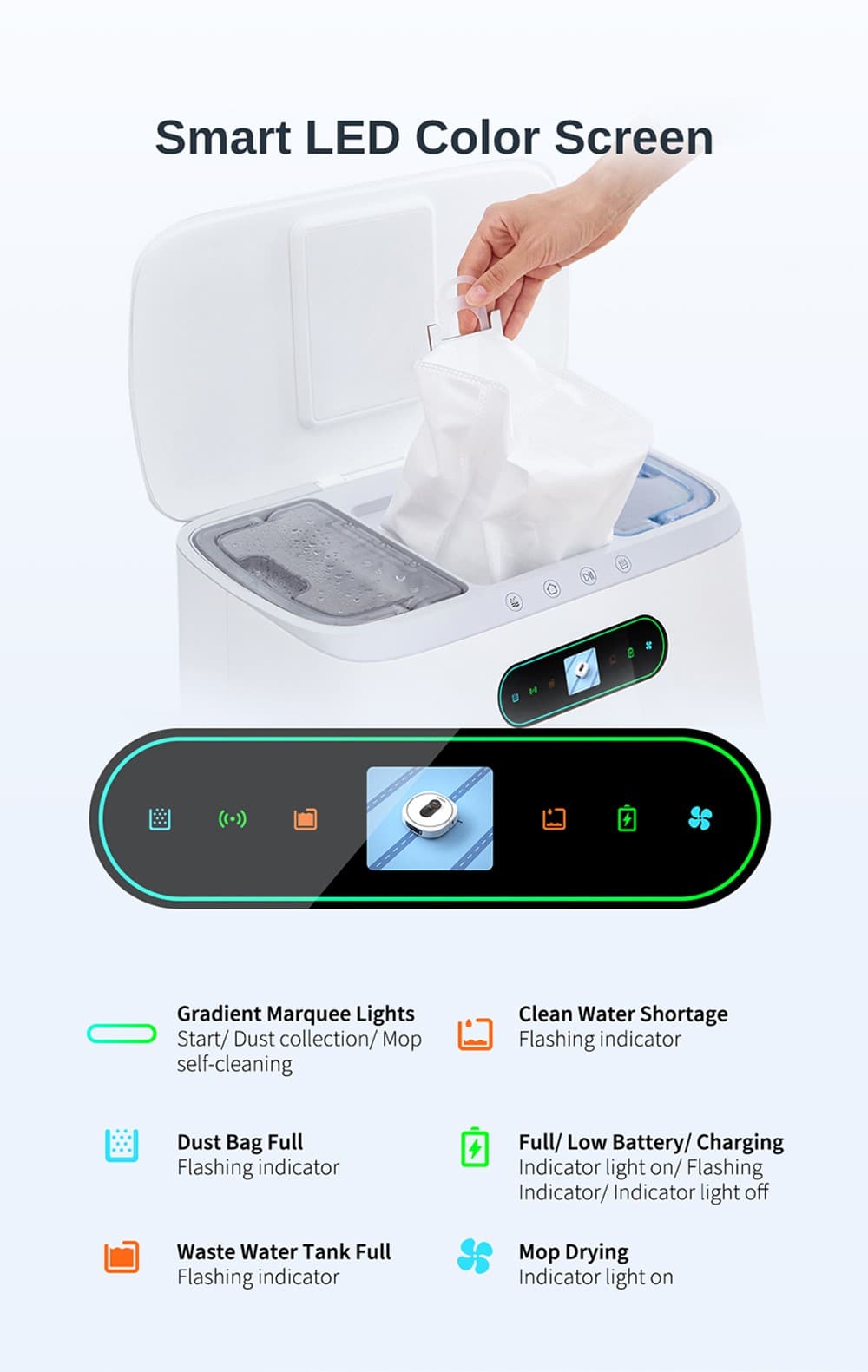 , το οποίο χρησιμοποιεί εικονίδια για να υποδείξει διάφορα συμβάντα. Η οθόνη μπορεί να σας ειδοποιήσει για μια γεμάτη σακούλα απορριμμάτων, να δείξει την κατάσταση της μπαταρίας στην ηλεκτρική σκούπα, το στέγνωμα των σφουγγαρίστρων ή την ανάγκη να αδειάσετε το δοχείο με βρώμικο νερό.