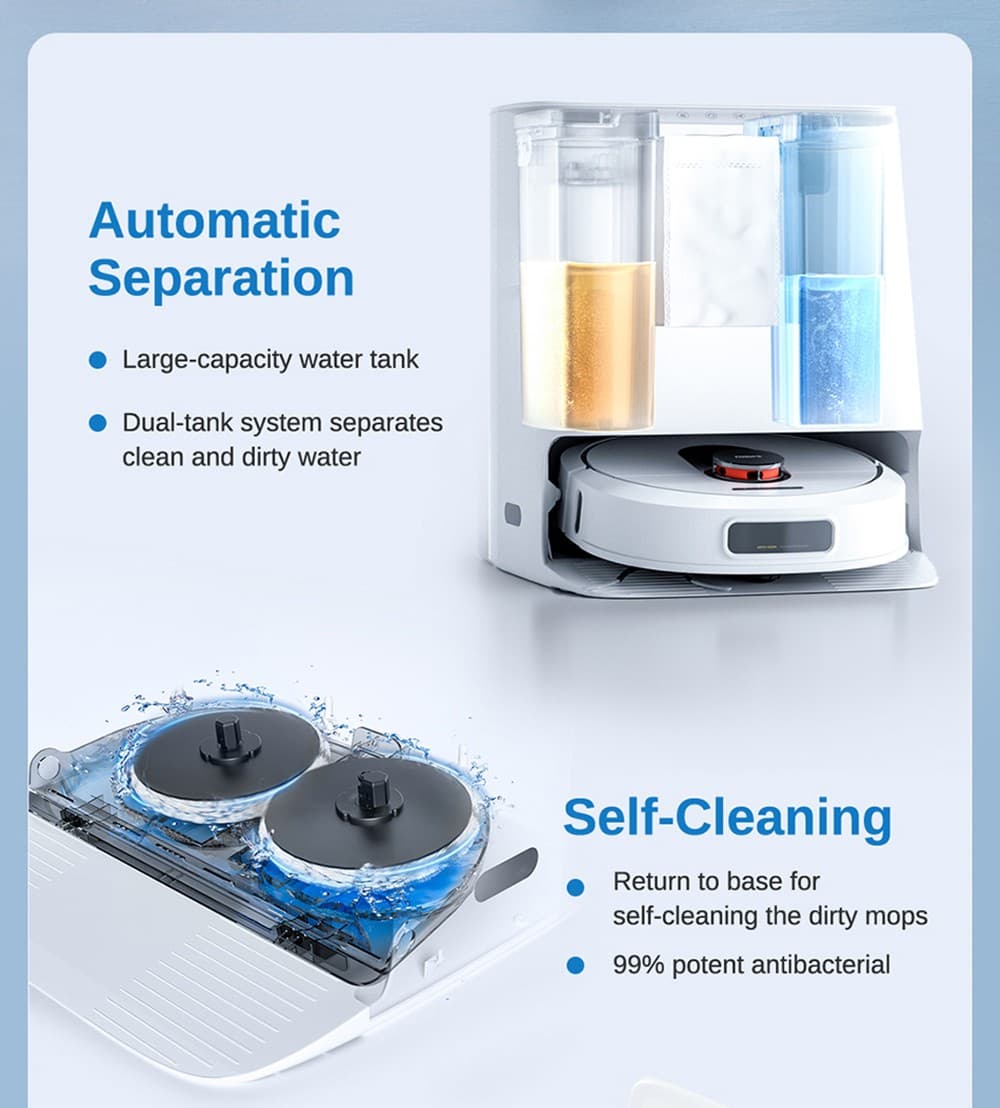 Έρχεται επίσης εξοπλισμένο με διπλή περιστρεφόμενη σφουγγαρίστρα, υψηλή ισχύ έως και 3200 pa, αυτόματο σταθμό με αυτοκαθαρισμό και μπαταρία 5200 mAh.
