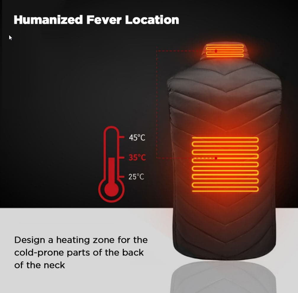 Το TENGOO HV-15, έχει δύο περιοχές θέρμανσης, μια στην πλάτη και μια στο σβέρκο, και 3 διαφορετικές θερμοκρασίες λειτουργίας, στους 25℃, 35℃ και 45℃.