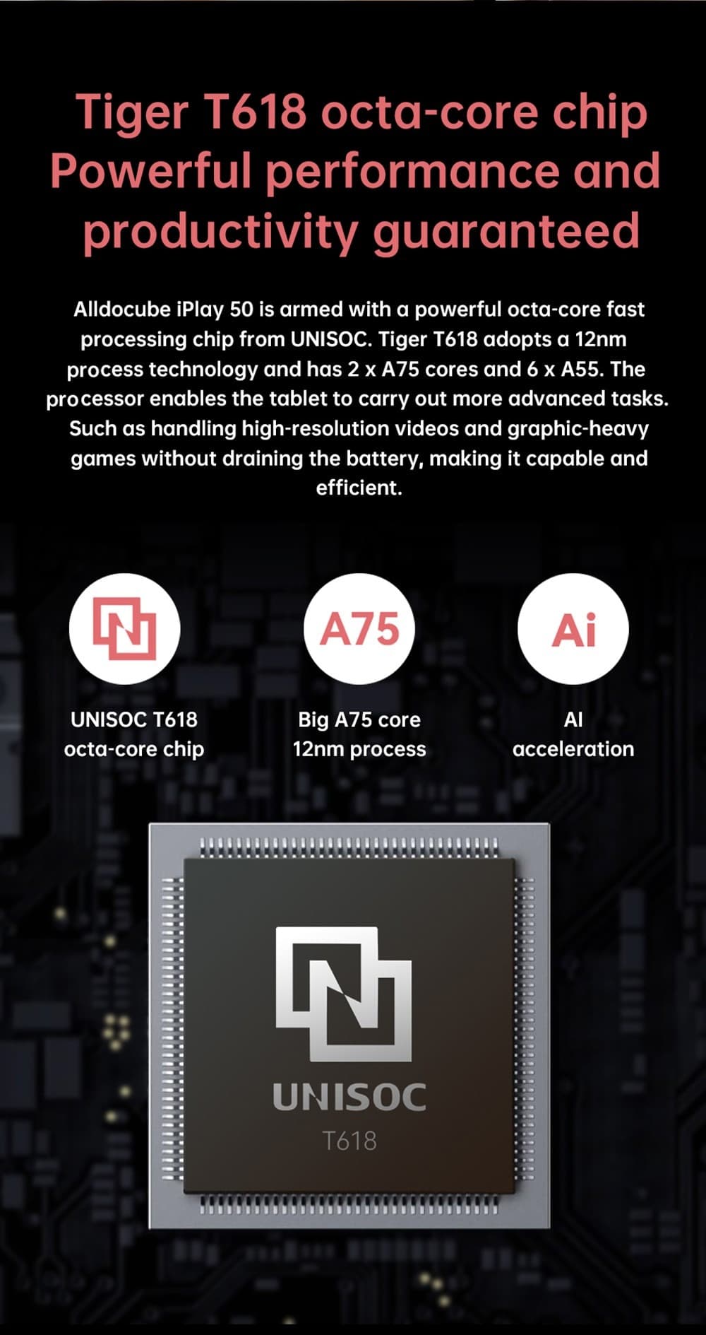 Στην καρδιά του βρίσκεται ο οκταπυρηνος Unisoc T618 που μπορεί σαν όνομα να μη σας λέει πολλά, αλλα απο επιδόσεις δεν είναι άσχημος. Κατασκευάζεται στα 12nm και έχει 2 ARM A75 πυρήνες στο μεγάλο Cluster, και 6x A55 πυρήνες στο μικρό, ενώ υποστηρίζει και το