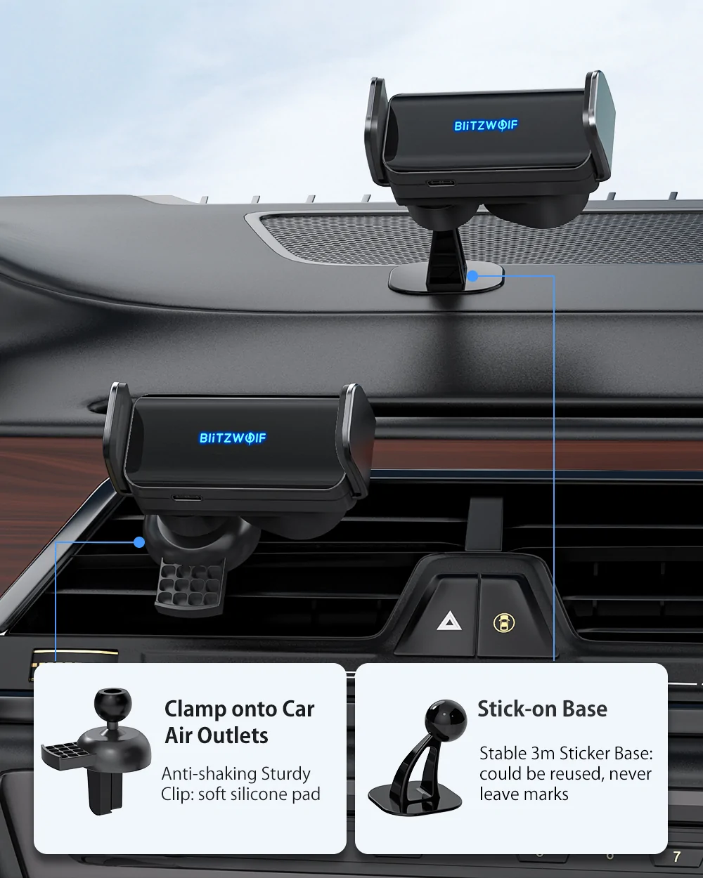 Η BlitzWolf BW-CF2 μπορεί να στερεωθεί στις γρίλιες του A/C ή στο ταμπλό του αυτοκινήτου σας, και η δαγκάνα της μπορεί να κρατήσει με ασφάλεια κινητά με πλάτος απο