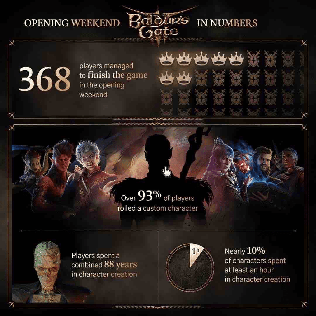 Last weekend, you played 1225 years of Baldur’s Gate 3. As we head into the second weekend of launch, we’ve compiled some tasty stats for you to sink your teeth into.