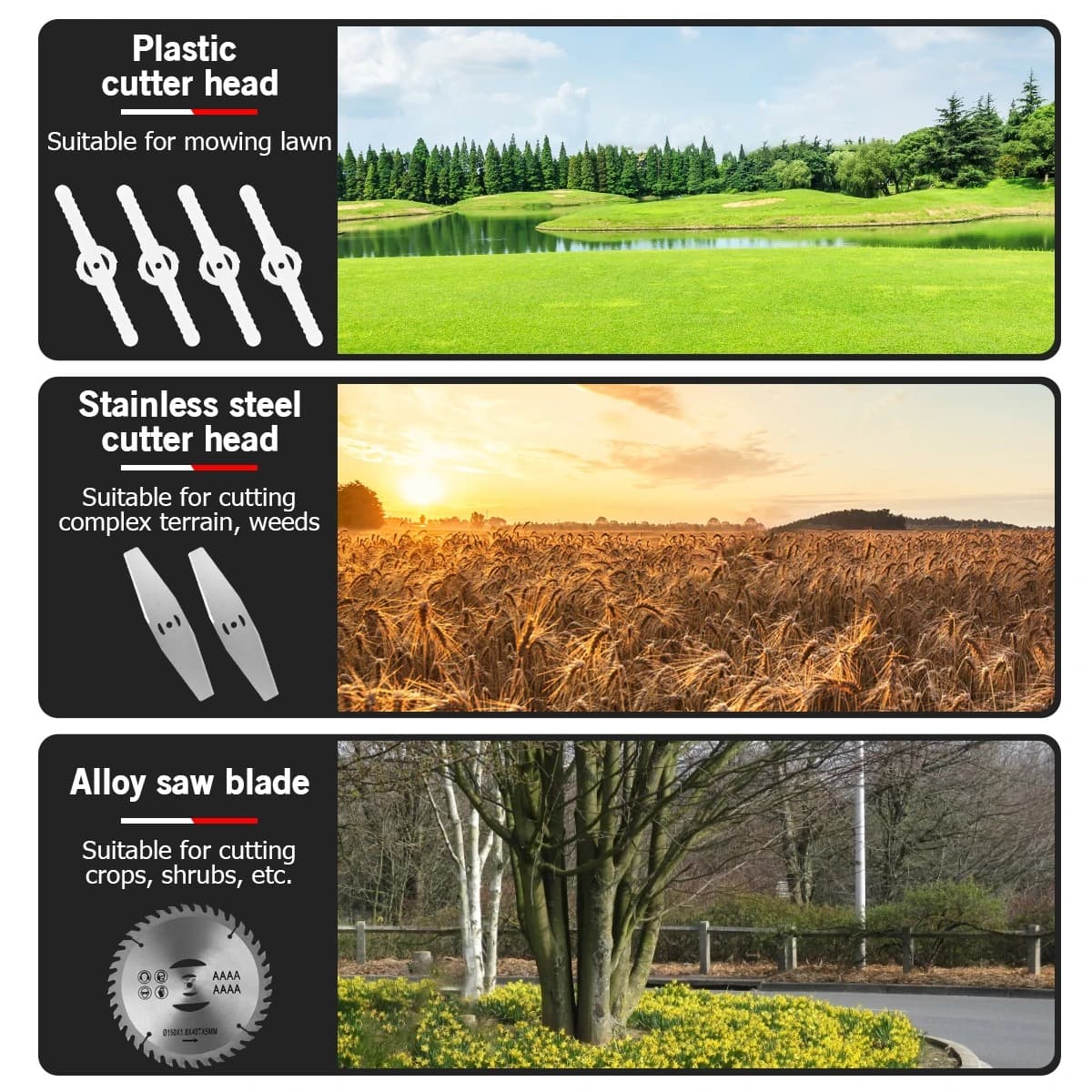 Πέρα απο το λεπτό σαν πέπλο, και κρύο σαν γρανίτα χιούμορ μου, που μου έχει επιτρέψει να κερδίσω χιλιάδες διαφωνίες με ξένους(στο ντουζ αργότερα που μου έρχονται οι καλές ιδέες, γιατί στο Live είμαι κότα) το θαμνοκοπτικό που σας έχω σήμερα, έχει αρκετές διαφορετικές χρήσεις, αφού στο πακέτο θα βρείτε από μια πλαστική κεφαλή κοπής, για μαλακά χόρτα και γκαζόν, μέχρι ατσάλινο δίσκο κοπής, και επίσης ατσάλινο δισκοπρίονο.