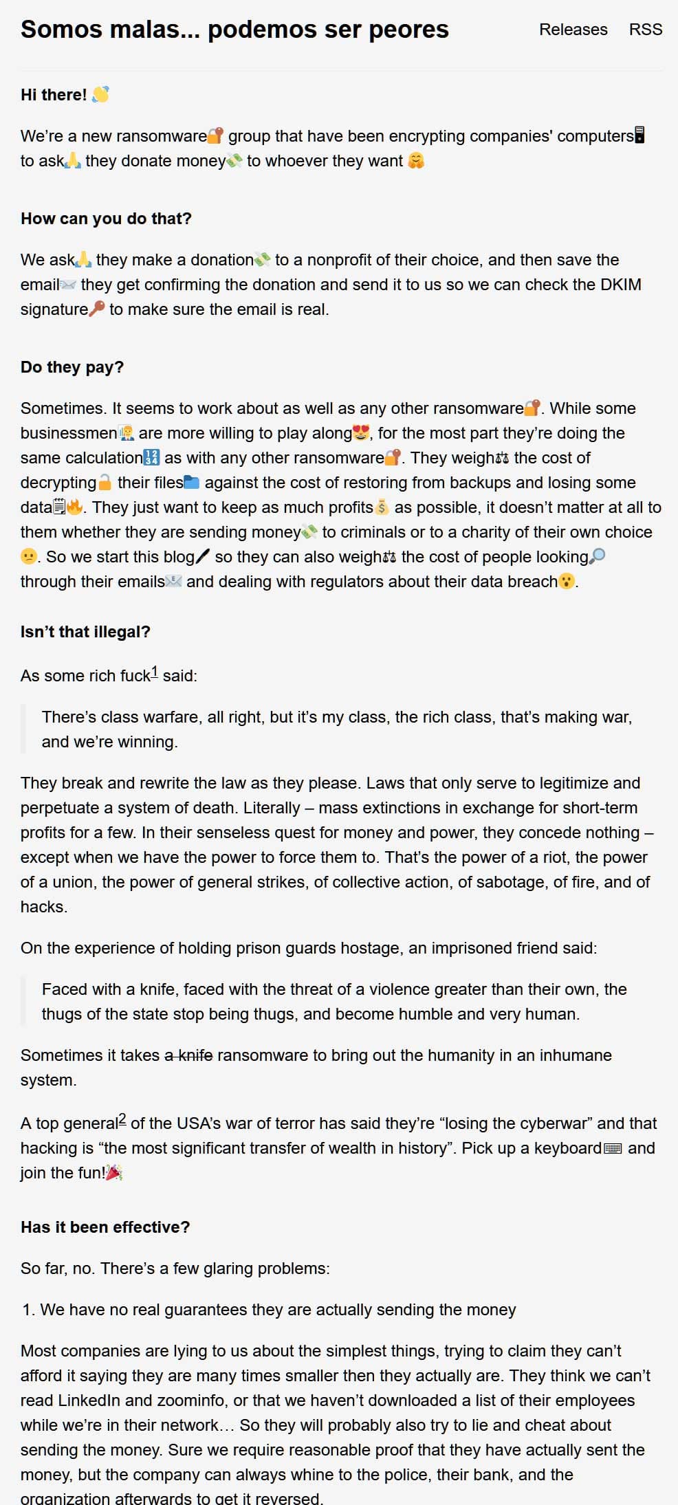 Η κύρια σελίδα του ιστότοπου διαρροής δεδομένων περιέχει επίσης ένα μακρύ μήνυμα γεμάτο emoji που εξηγεί τι αντιπροσωπεύουν και τα λύτρα που απαιτούν.
