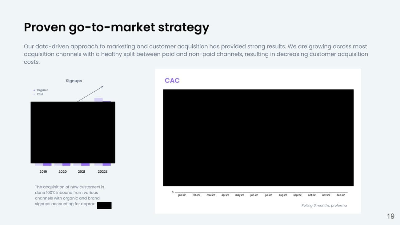 Η εταιρεία διέγραψε τα δεδομένα από τη διαφάνεια 19, αλλά μπορείτε ακόμα να μάθετε κάτι από αυτό: Το κόστος απόκτησης πελατών εξακολουθεί να είναι ζωτικής σημασίας και εάν μπορείτε να το αναφέρετε ως γράφημα μέσου όρου μετάδοσης, λέτε στους επενδυτές ότι γνωρίζετε ότι είναι σημαντικό, το παρακολουθείτε και εργάζεστε ενεργά για να το βελτιώσετε.