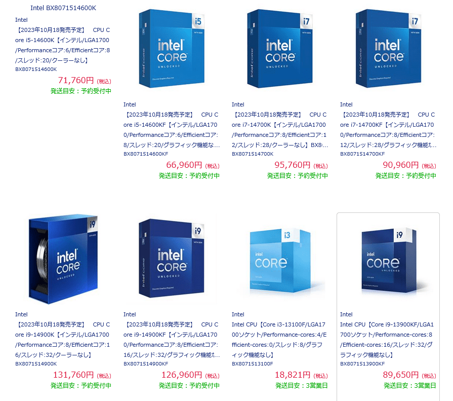 Είχαμε δει στο παρελθόν καταχωρίσεις σε καναδικούς και ευρωπαϊκούς λιανοπωλητές με τους πρώτους να εμφανίζουν τιμές ίσες με τους επεξεργαστές 13ης γενιάς και οι δεύτεροι να παρουσιάζουν διαφορά τιμής 15%. Οι πιο πρόσφατοι επεξεργαστές Raptor Lake 14ης γενιάς έχουν πλέον καταχωρηθεί από Ισπανούς και Ιάπωνες λιανοπωλητές, οι οποίοι παρουσιάζουν