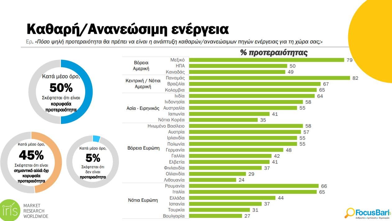 Στο ερώτημα πόσο σημαντική θα πρέπει να είναι η ανάπτυξη των ανανεώσιμων πηγών ενέργειας για τη χώρα τους, ο μέσος όρος των 27 χωρών δείχνει ότι ο ένας στους δύο πολίτες (50%) το θεωρεί κορυφαία προτεραιότητα. Αυτή η αναλογία φτάνει τους οκτώ στους δέκα στο