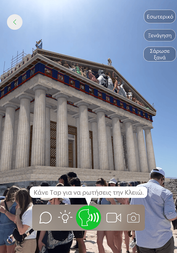 Φέρνει στην οθόνη των κινητών συσκευών επιστημονικά τεκμηριωμένες εικονικές ψηφιακές αναπαραστάσεις επιλεγμένων μνημείων της Ακρόπολης των Αθηνών, όπως ήταν στην κλασική αρχαιότητα και στα ρωμαϊκά χρόνια, με ιστορικές πληροφορίες που επικοινωνεί η ψηφιακή βοηθός Κλειώ, είτε με αυτόματη ξενάγηση, είτε μέσα από διάλογο σε πραγματικό χρόνο.