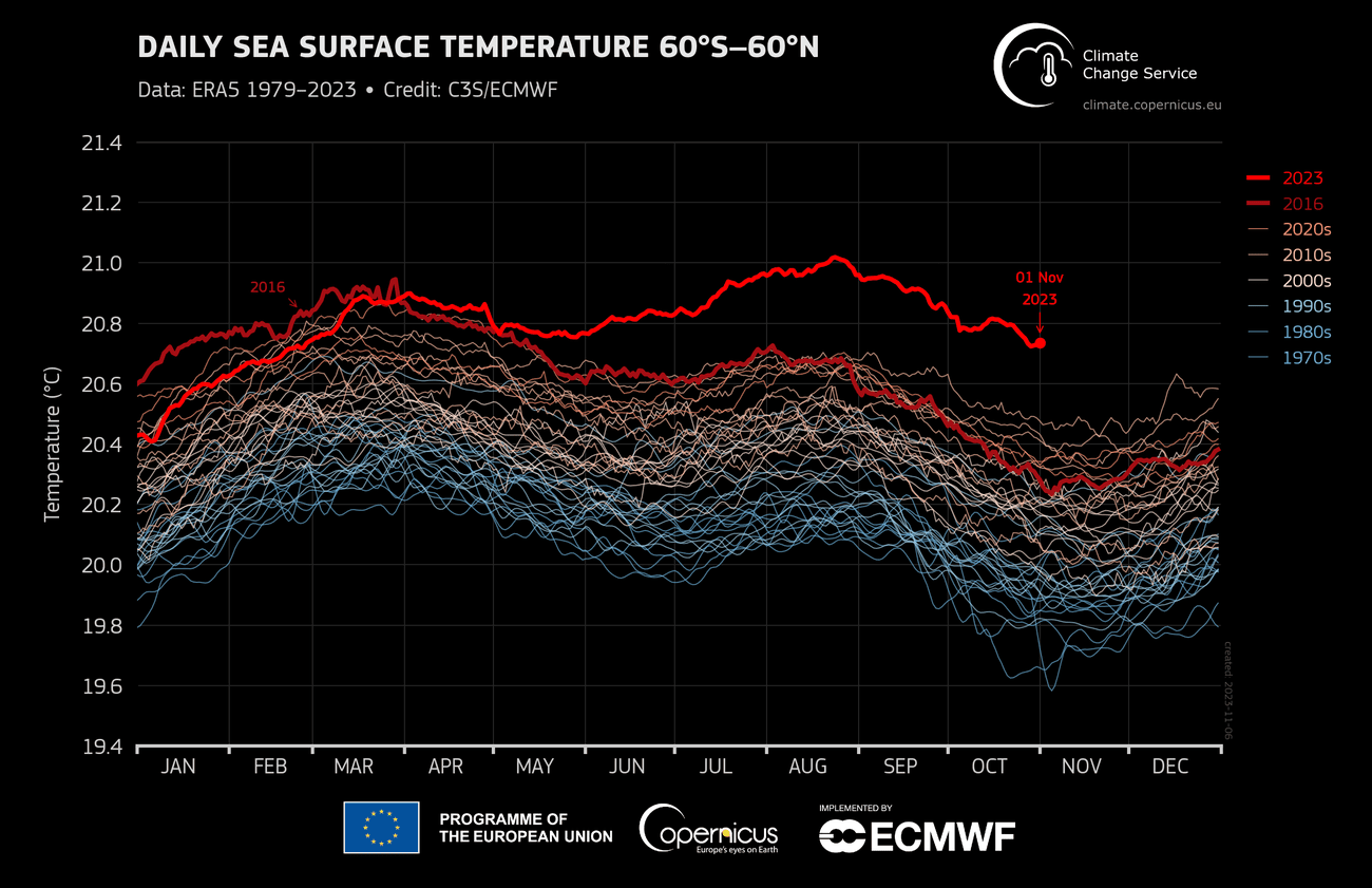 Η φετινή χρονιά είδε και την ένταση του φαινομένου El Nino το οποίο θερμαίνει τα νερά στο νότιο Ειρηνικό. Οι επιστήμονες περιμένουν τα χειρότερα για το τέλος του 2023 και στις αρχές του επόμενου έτους. Οι παγκόσμια μέση θερμοκρασία ήταν η υψηλότερη από την αρχή του έτους, μέχρι και το 1940. Λαμβάνοντας υπόψη δεδομένα κλίματος όπως δακτύλιοι δέντρων και πυρήνες πάγου, φαίνεται πως οι θερμοκρασίες της φετινής χρονιάς είναι χωρίς προηγούμενο στην ανθρώπινη ιστορία και μιλάμε πιθανώς για τη θερμότερη χρονιά σε 100.000 χρόνια ιστορίας. Ο μέσος όρος θερμοκρασίας της θάλασσας εξαιρουμένων των πολικών περιοχών, έφτασε τους 20.79 βαθμούς Κελσίου.