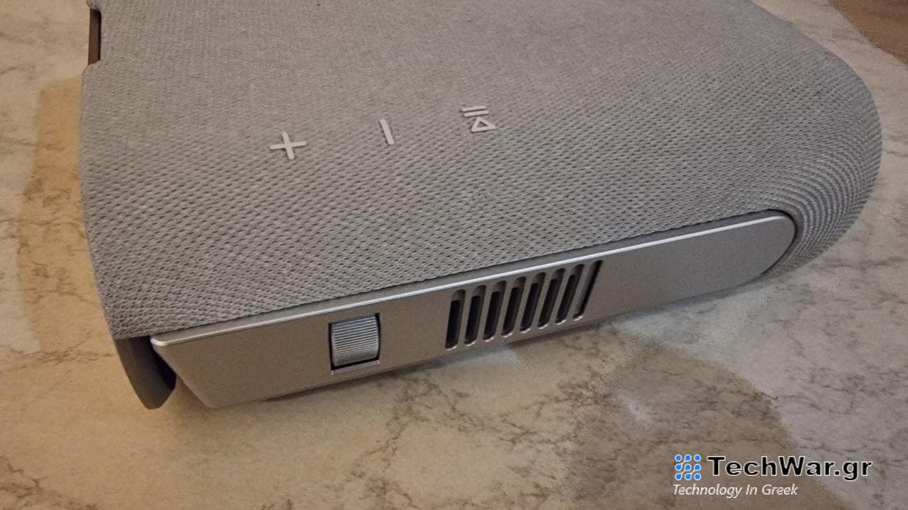 Όταν είναι ενεργοποιημένο, ένα χαμηλό φως ανάβει κάτω από το υφασμάτινο περίβλημα για να σας ενημερώσει ότι είναι λειτουργικό, μαζί με ένα άλλο σετ φώτων που σας ενημερώνουν για το επίπεδο μπαταρίας του ViewSonic M1 Pro.
