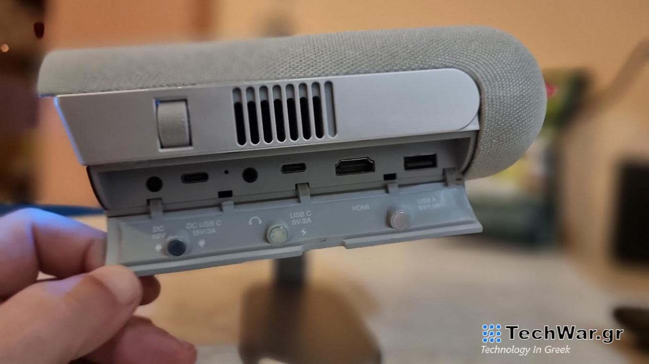 Υπάρχουν υποδοχές για σύνδεση ρεύματος και ενσύρματη σύνδεση ακουστικών/ηχείων, μαζί με δύο θύρες USB Type-C, μία θύρα USB Type-A και μια θύρα HDMI.