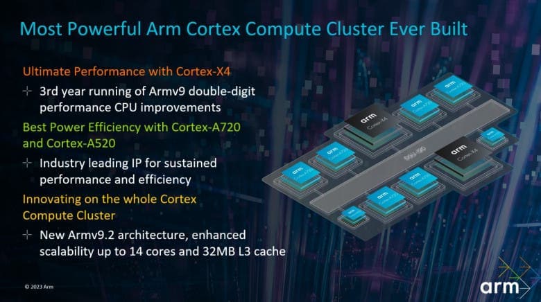 Το νέο Cortex-X4 θα αναλάβει βαριές εργασίες με ένα νήμα, υπόσχεται 15% υψηλότερη απόδοση από το X3 με ίση ισχύ (το οποίο από μόνο του πήγε 25% πιο γρήγορα από το X2). Για ίση απόδοση, το X4 μπορεί να προσφέρει τεράστια μείωση κατά 40% στη χρήση ισχύος. Αλλά το X4 είναι κατασκευασμένο για ταχύτητα, στην πραγματικότητα, είναι ο ταχύτερος πυρήνας CPU που σχεδίασε ποτέ η ARM και αναμένεται να φτάσει σε ταχύτητες ρολογιού 3,4 GHz. Ο Cortex-A720 είναι βελτιστοποιημένος για αποτελεσματικότητα ακόμη περισσότερο από τους πυρήνες A700 πριν από αυτόν. Είναι 20% πιο αποδοτικό από το A715, το οποίο από μόνο του ήταν 20% πιο αποδοτικό από το A710. Με πέντε πυρήνες A720, θα κάνουν μεγάλο μέρος της βαριάς εργασίας για φόρτους εργασίας πολλαπλών νημάτων και θα το κάνουν αποτελεσματικά. Τέλος, το Cortex-A520 εξακολουθεί να είναι ένα in-order core. Είναι σχεδιασμένο έτσι ώστε δύο πυρήνες να μπορούν να μοιράζονται τις μονάδες εκτέλεσης για να καταλαμβάνουν όσο το δυνατόν λιγότερο χώρο στο πυρίτιο. Ο άλλος σχεδιαστικός στόχος ήταν να καταναλώσει το λιγότερο δυνατόν ρεύμα και το A520 είναι 22% πιο αποδοτικό από το A510. Σε chipset υψηλών προδιαγραφών, αυτά πιθανότατα θα επικεντρωθούν σε εργασίες παρασκηνίου.