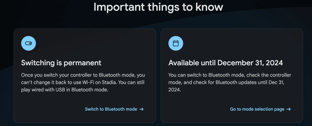 , το εργαλείο της Google λέει τώρα ότι οι χρήστες μπορούν να μετατρέψουν το Stadia Controller τους σε Bluetooth έως τις 31 Δεκεμβρίου 2024, μια πλήρης επέκταση ενός έτους. Η αλλαγή φαίνεται να έχει γίνει τις τελευταίες ημέρες, καθώς εξακολουθεί να αναφέρεται ως 31 Δεκεμβρίου 2023, μόλις την περασμένη εβδομάδα.