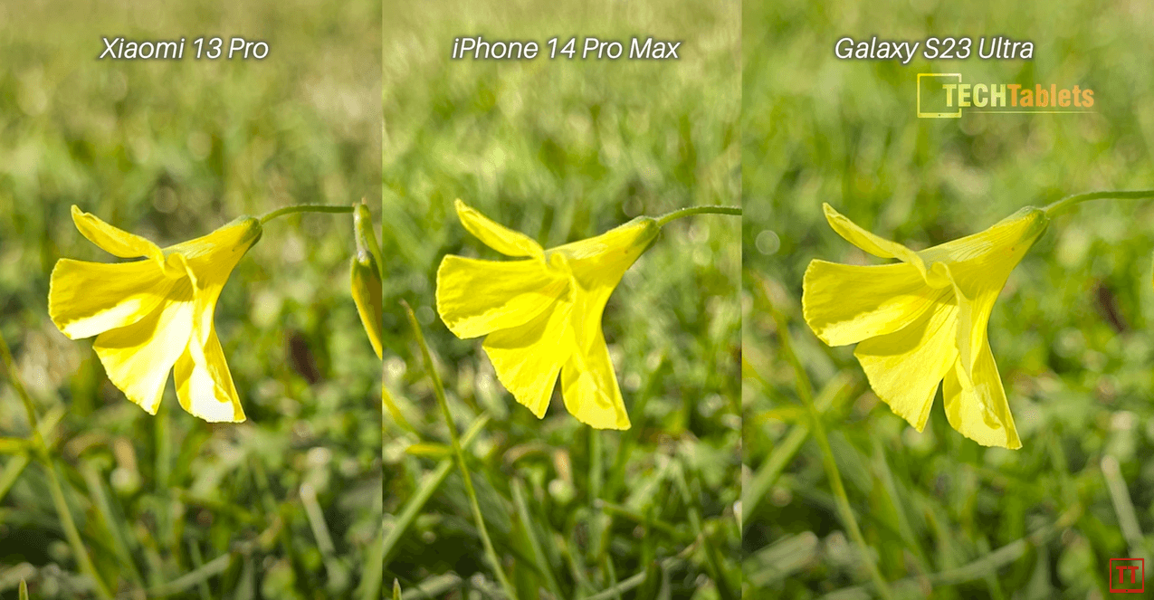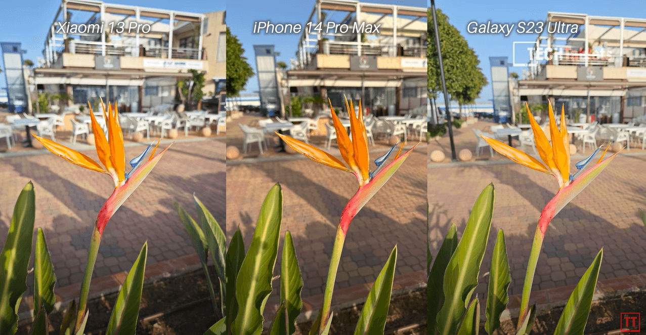 Η Xiaomi κερδίζει στην ακρίβεια χρωμάτων σε εξωτερικούς χώρους και έχει την πιο βέλτιστη οθόνη χωρίς υπερβολικά εφέ λογισμικού, σε αντίθεση με το iPhone 14 Pro, που δεν χειρίστηκε πολύ καλά τη φωτογραφία με ένα ανθισμένο λουλούδι. Η κοντινή φωτογραφία έχει το πάνω χέρι με το Galaxy S23 Ultra.