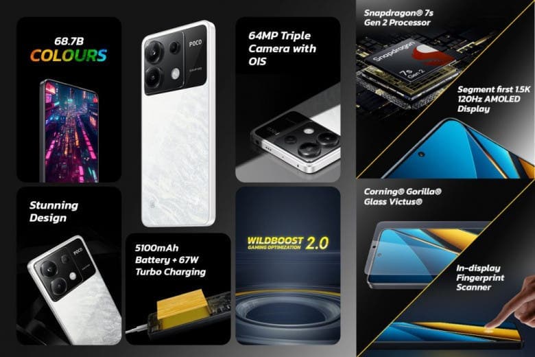 Το POCO X6 στην Ινδία, μαζί με το POCO X6 Pro. Διαθέτει οθόνη OLED 6,67 ιντσών 1,5K 120Hz με μέγιστη φωτεινότητα έως 1800 nits, βάθος χρώματος 12 bit και έχει προστασία Corning Gorilla Glass Victus. Το τηλέφωνο τροφοδοτείται από Snapdragon 7s Gen 2 SoC, έχει περιοχή ψύξης 13581mm², έως 12GB RAM και έως 512GB αποθηκευτικό χώρο. Διαθέτει κύρια κάμερα 64MP με OIS, κάμερα υπερευρυγώνιας γωνίας 8MP και macro 2MP. Μπροστά θα βρούμε μια κάμερα 16MP.