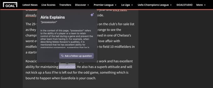 Η εταιρεία λέει ότι το μοναδικό πράγμα για την Airis, τον βοηθό της AI, είναι ότι κατανοεί το πλαίσιο μιας σελίδας και σας δίνει απαντήσεις με βάση αυτό. Ακολουθεί ένα καλό παράδειγμα: εάν διαβάζετε για τη Μάντσεστερ Γιουνάιτεντ, ζητήστε από τον Άιρις να σας εξηγήσει το “Γιουνάιτεντ” ή κάντε ερωτήσεις σχετικά με αυτό, το ρομπότ καταλαβαίνει ότι ρωτάτε για την ποδοσφαιρική ομάδα και όχι μόνο για τη λέξη.