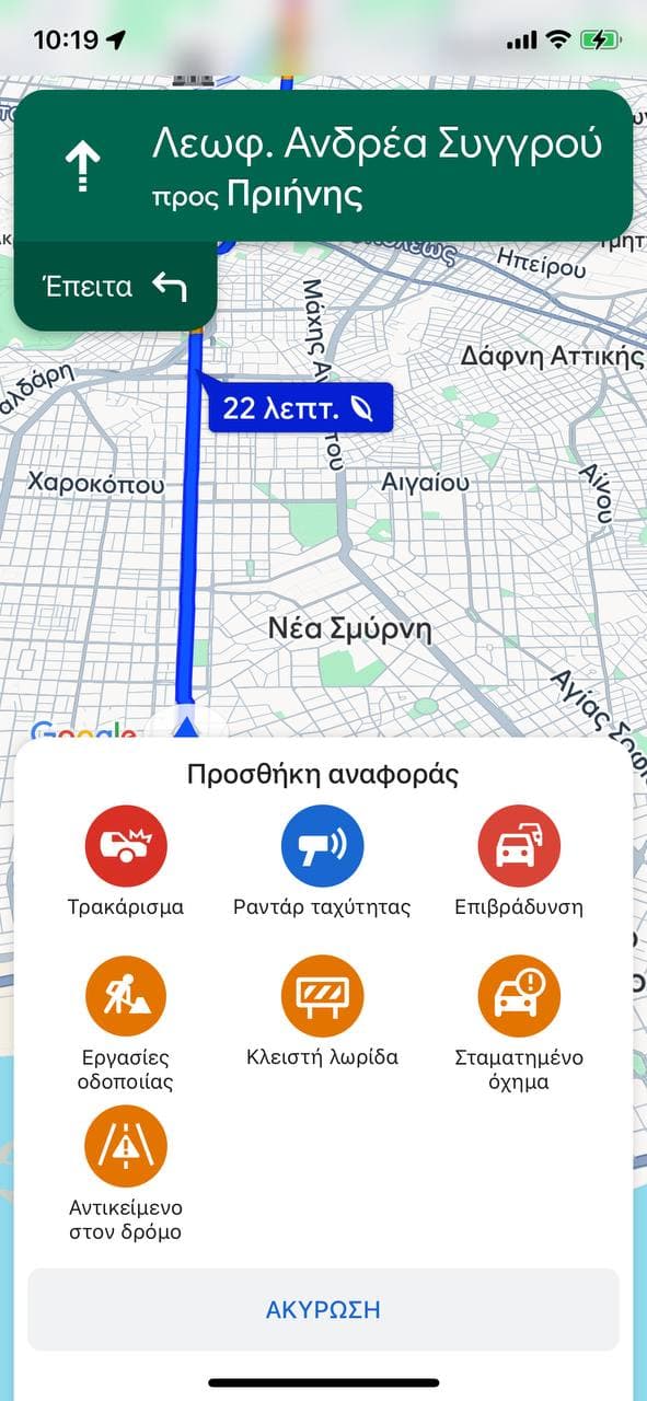Η ενημέρωση γίνεται με τον εξής τρόπο. Πατάτε επάνω στην καρτέλα που σας ενημερώνει για τον χρόνο άφιξής σας. Η πρώτη επιλογή ονομάζεται «προσθήκη αναφοράς». Μόλις την επιλέξετε, εμφανίζεται μία νέα καρτέλα με 7 επιλογές. Πρόκειται για τις πιθανές αιτίες συμφόρησης.