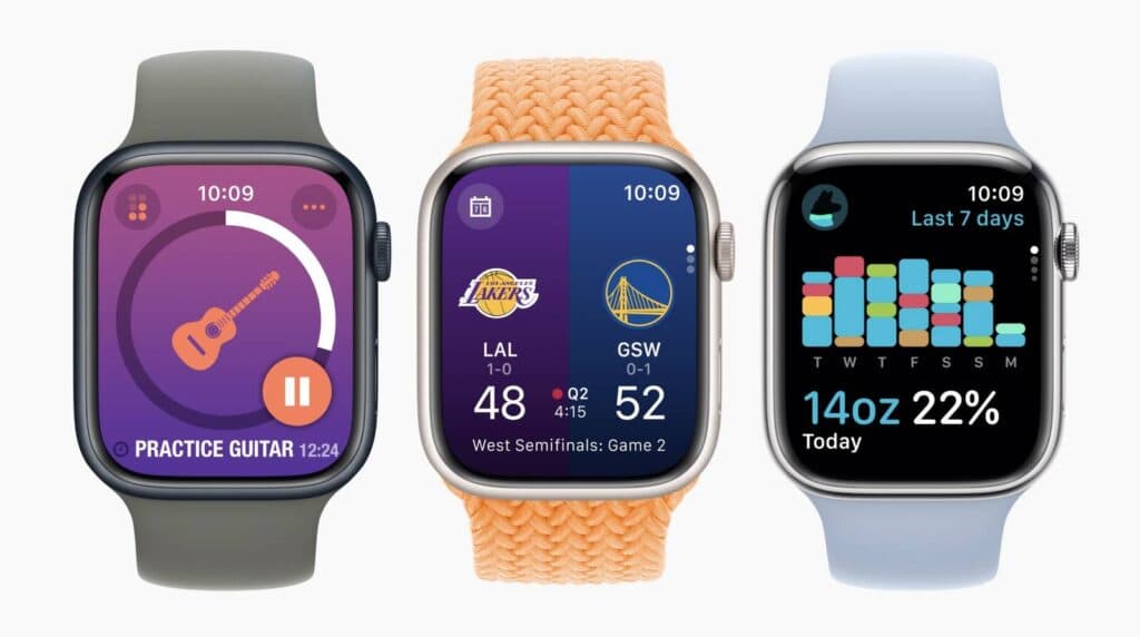 Το watchOS 10 διαθέτει έναν νέο τρόπο προβολής πληροφοριών από οποιοδήποτε πρόσωπο ρολογιού με widget. Απλώς μετακινηθείτε με το Digital Crown για να αποκαλύψετε μια δυναμικά Έξυπνη Στοίβα γραφικών στοιχείων κάτω από την πρόσοψη του ρολογιού που αλλάζουν ανάλογα με τις ανάγκες του χρήστη οποιαδήποτε στιγμή της ημέρας. Το watchOS 10 περιλαμβάνει επίσης δύο νέες προσόψεις ρολογιών: το “Palette” και ένα κινούμενο πρόσωπο “Peanuts” με τον Snoopy και το Woodstock.
