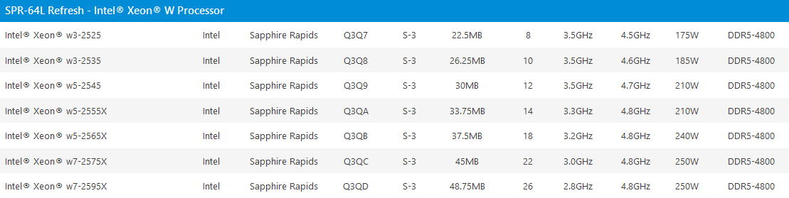 Όλα τα SKU λαμβάνουν ονομαστική αύξηση αριθμού 2 πυρήνων, ενώ το Xeon W7-2575X διαθέτει αύξηση 4 πυρήνων. Όλες οι CPU θα είναι συμβατές με τις υπάρχουσες μητρικές πλακέτες W790 HEDT και σταθμών εργασίας με υποστήριξη μνήμης