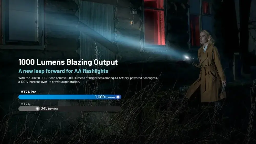 Ο NITECORE MT2A Pro διαθέτει ισχυρό LED φακό, που παρέχει φωτεινότητα έως και 1000 lumens. Αυτό είναι αρκετό φως για να φωτίσει ένα σκοτεινό δωμάτιο ή να φωτίσει ένα μακρινό αντικείμενο. -