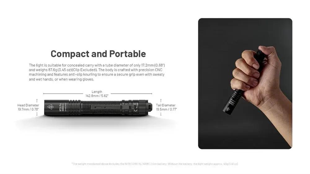 Ο NITECORE MT2A Pro διατίθεται με επαναφορτιζόμενη μπαταρία NL1416R. Αυτή η μπαταρία προσφέρει έως και 20 ώρες λειτουργίας με μέγιστη φωτεινότητα. -