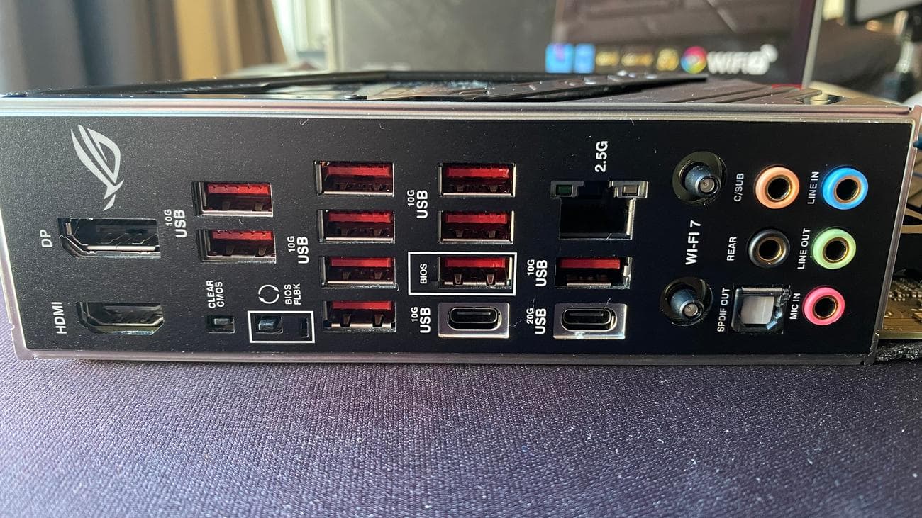 Στο back panel της μητρικής θα βρούμε πληθώρα USB θυρών, έντεκα USB Type A 3.2 Gen 2 με ταχύτητα 10Gbps, μια USB Type C 3.2 Gen 2 με ταχύτητα 10Gbps και μια USB Type C 3.2 Gen 2X2 με ταχύτητα 20Gbps. Επίσης θα βρούμε την Ethernet θύρα των 2.5Gbps, την θύρα HDMI, την θύρα DisplayPort, τις επιχρυσωμένες θύρες του ήχου, την οπτική έξοδο και τις συνδέσεις της κεραίας του Wi-Fi. Τέλος θα βρούμε δυο πολύ χρήσιμα κουμπιά, το ένα κάνει reset τις ρυθμίσεις του BIOS σε περίπτωση που κάτι δεν πήγε καλά στις ρυθμίσεις μας και το δεύτερο κάνει update το BIOS από εξωτερικό USB flash drive ακόμα και χωρίς επεξεργαστή ή μνήμη πάνω στην μητρική.