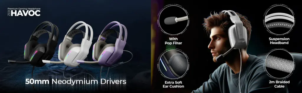 Έχοντας τρεις διαφορετικές χρωματικές επιλογές, συμπεριλαμβανομένων Μαύρο, Μωβ και Λευκό, τα Zeb-Havoc είναι τα πιο premium ακουστικά, τα οποία θα σας βοηθήσουν να προσφέρουν μια εντυπωσιακή εμπειρία παιχνιδιού με τις διαδραστικές τους δυνατότητες, όπως η καθηλωτική ποιότητα ήχου για μια ρεαλιστική εμπειρία παιχνιδιού, κομψό αλλά κομψή σχεδίαση με υποστήριξη φωτισμού που φαίνεται τόσο κομψό, πρόσθετη υποστήριξη επένδυσης ή απορρόφησης κραδασμών, πολυλειτουργικά κουμπιά για πιο βολικά χειριστήρια και βαθιά μπάσα για πολύ βελτιωμένο και καθαρό ήχο που σας επιτρέπει να έχετε μια ρεαλιστική εμπειρία παιχνιδιού.