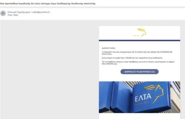 Οι πιο υποψιασμένοι αντιλαμβάνονται ότι η ηλεκτρονική διεύθυνση αποστολής δεν έχει καμία σχέση με τα ΕΛΤΑ, άρα πρόκειται για προσπάθεια απόσπασης ευαίσθητων προσωπικών δεδομένων.