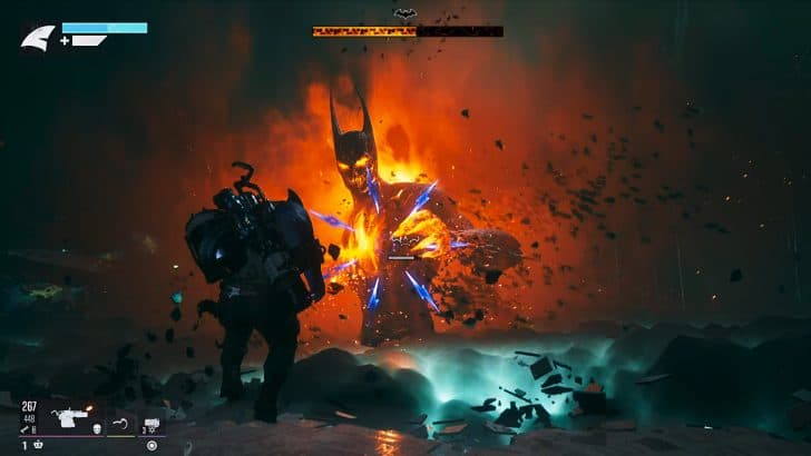 Μόλις ρίξετε το γκάζι και στα τέσσερα μέλη του Squad, ήρθε η ώρα να αντιμετωπίσετε έναν γιγάντιο, λαμπερό δαίμονα Batman, που… στην πραγματικότητα