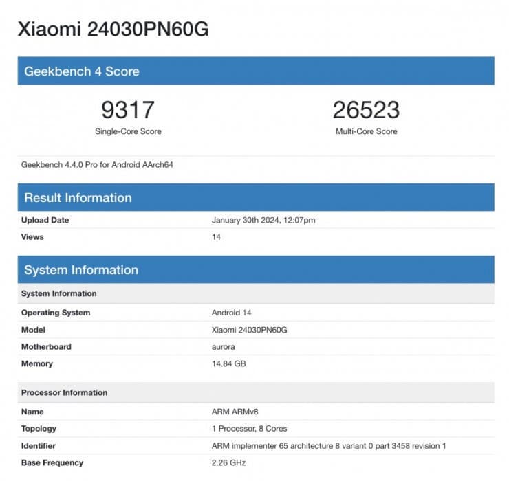 Φημολογείται ότι θα κυκλοφορήσει τον επόμενο μήνα, το Xiaomi 14 Ultra είναι ένα από τα πιο αναμενόμενα τηλέφωνα του 2024 και τώρα έχουμε μια λίστα από το Geekbench. Το 14 Ultra εντοπίστηκε με τον αριθμό μοντέλου Xiaomi 24030PN60G και το αναγνωριστικό «aurora». Η συσκευή σημείωσε 9.317 βαθμούς στη δοκιμή ενός πυρήνα και κατάφερε να σημειώσει 26.523 βαθμούς στη δοκιμή πολλαπλών πυρήνων. Οι αριθμοί είναι διογκωμένοι καθώς πραγματοποιήθηκαν στην παλαιότερη έκδοση του Geekbench 4 αντί για την τρέχουσα Geekbench 6. Η συσκευή είναι εξοπλισμένη με το chipset Snapdragon 8 Gen 3 με βασική συχνότητα 2,26 GHz. Η λίστα επιβεβαιώνει επίσης ότι το 14 Ultra θα είναι διαθέσιμο με 16 GB RAM και θα τρέχει Android 14 πιθανώς με Xiaomi HyperOS. Το 14 Ultra φημολογείται ότι διαθέτει κύριο αισθητήρα τύπου Sony LYT-900 1 ιντσών με ευρύτερο μεταβλητό διάφραγμα, κυρτή οθόνη AMOLED 1440p και ασύρματη φόρτιση 80 W.