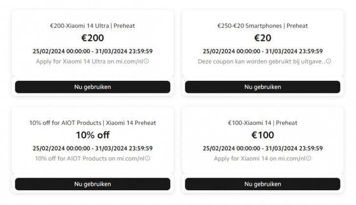 βρήκε μια άλλη υπόδειξη ότι σε αντίθεση με το 14 Pro, το Xiaomi 14 Ultra έρχεται στην Ευρώπη. Αυτό συνάδει με προηγούμενες φήμες ότι το μοντέλο Ultra έρχεται με τη ναυαρχίδα Xiaomi 13 στις παγκόσμιες αγορές. Και τώρα μπορούμε επίσης να προσθέσουμε μια ημερομηνία που θα περιμένουμε με ανυπομονησία. Μόλις εγγραφείτε στον ολλανδικό ιστότοπο της Xiaomi, θα λάβετε μερικά εκπτωτικά κουπόνια, ένα από τα οποία είναι για το 14 Ultra. Το κουπόνι των 200 ευρώ μπορεί να χρησιμοποιηθεί ανά πάσα στιγμή μεταξύ 25 Φεβρουαρίου και 31 Μαρτίου, αν φυσικά παραγγείλετε ένα Ultra.