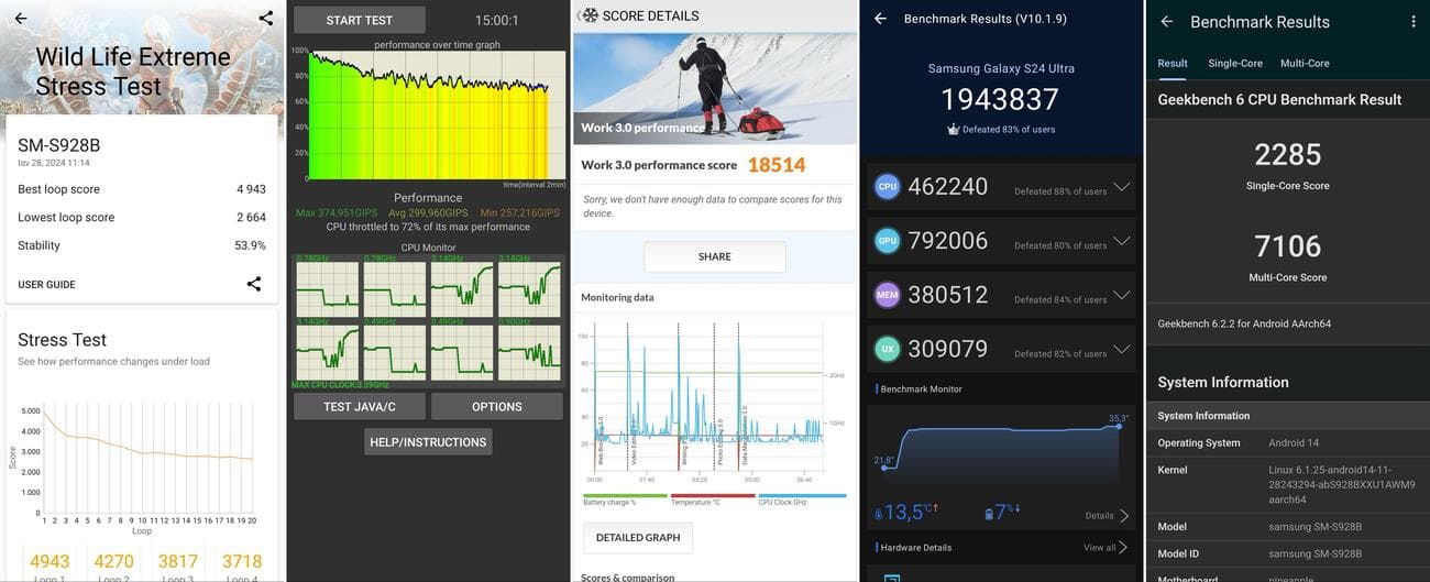 Οι επιδόσεις πάντως δεν έχουν να ζηλέψουν σε τίποτα όχι μόνο τις ναυαρχίδες της Apple, αλλά και του Android ανταγωνισμού. Όπως βλέπουμε και στα benchmarks, το Galaxy S24 Ultra κρύβει αρκετή δύναμη για να ανταπεξέλθει ακόμα και στις μεγαλύτερες απαιτήσεις των χρηστών ή σε multitasking με ευκολία, ενώ είναι και εξαιρετικό ακόμα και στα πιο απαιτητικά παιχνίδια. Στις δοκιμές μας είδαμε ελάχιστη αύξηση της θερμοκρασίας μετά από αρκετή ώρα gaming, κάτι που δείχνει ότι όντως έχει γίνει αρκετά καλή δουλειά στη διαχείριση της θερμότητας. Επιπλέον, δε συναντήσαμε πουθενά κάποιο κόλλημα, με τις επιδόσεις να μένουν σταθερές στις δύο εβδομάδες που χρησιμοποιούμε τη συσκευή ως κύρια συσκευή μας. Ένα ακόμα θετικό στοιχείο είναι η μπαταρία, καθώς τα 5.000mAh σε συνδυασμό με το νέο chipset μπορούν να βγάλουν τη μέρα άνετα σε οποιαδήποτε συνθήκη. Στις δοκιμές μας καταφέραμε να ξεπεράσουμε τις 9 ώρες SOT, με όλες τις ρυθμίσεις στην αυτόματη λειτουργία, ένα εντυπωσιακό στοιχείο που βελτιώνει τη μπαταρία ακόμα παραπάνω σε σχέση με το Galaxy S23 Ultra.