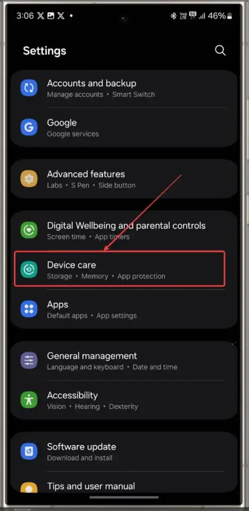 Κάντε κύλιση προς τα κάτω και πατήστε στην καρτέλα Φροντίδα συσκευής.