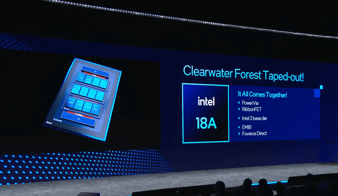Επιπλέον, η εταιρεία αποκάλυψε επίσης ότι έχει ήδη μαγνητοσκοπήσει τους CPU της επόμενης γενιάς Clearwater Forest Xeon E-Core ενώ το 18A είναι έτοιμο για πλήρη σχεδίαση προϊόντων το 2ο τρίμηνο του 2024. Η Chipzilla επιβεβαίωσε επίσης μερικά στοιχεία σχετικά με το Clearwater Forest που ακούγαμε για τις τελευταίες εβδομάδες. Θα χρησιμοποιεί διάφορες τεχνολογίες όπως: