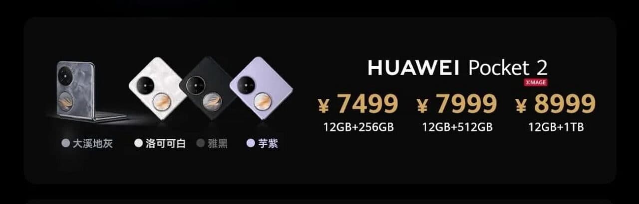 Το Huawei Pocket 2 προσφέρει τρεις εκδόσεις αποθηκευτικού χώρου για να ταιριάζει σε κάθε ανάγκη: 12GB + 256GB, 12GB + 512GB και 12GB + 1TB. Για τους χρήστες που αναζητούν την απόλυτη πολυτέλεια υπάρχει διαθέσιμη και η Art Customised Edition η οποία κατασκευάζεται με διαδικασία 3D Dynamic Space στο πίσω κάλυμμα, και έχει γυαλί