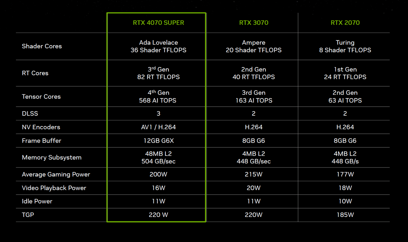 AD104 με την RTX 4070 και την RTX 4070 Ti και από πλευράς προδιαγραφών πλησιάζει την 4070 Ti. Από τους 60 πυρήνες που έχει το chip, η RTX 4070 Super έχει ενεργοποιημένους τους 56. Συγκριτικά, η RTX 4070 είχε ενεργοποιημένους μόνο τους 46. Εκτός από την αύξηση των ενεργών πυρήνων, η Nvidia προίκισε την RTX 4070 Super με 48 MB προσωρινής μνήμης L2 σε σύγκριση με τα 36 MB της RTX 4070. H κύρια μνήμη της 4070 Super παραμένει στα 12 GB DDR6X με ταχύτητα 504GB/sec. Η ολική ισχύς λειτουργίας της GPU είναι στο πολύ καλό νούμερο των 220W όσο δηλαδή ήταν και της 3070, η οποία συγκριτικά έχει σχεδόν την μισή απόδοση.