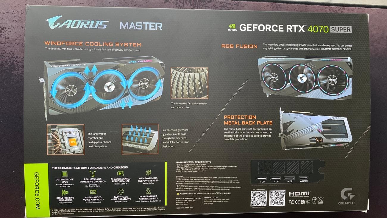 Η Gigabyte Aorus GeForce RTX 4070 Super Master υποστηρίζει 4 εξόδους εικόνας, τρεις Display Port 1.4a και μια HDMI 2.1. Υποστηρίζει PCI-E 4.0 και για την τροφοδοσία της χρειαζόμαστε δύο 8πινα καλώδια (μέσω του γνωστού παρεχόμενου 16πινου αντάπτορα) και ένα προτεινόμενο τροφοδοτικό 700W.