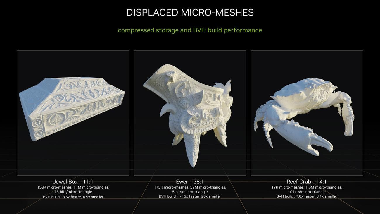 Η τρίτη αναβάθμιση εμπεριέχεται στους 3ης γενιάς πυρήνες Ray Tracing: Η αναβαθμισμένη λειτουργία του μηχανισμού Micromap Opacity Engine επιταχύνει την επεξεργασία των υπολογισμών του Ray Tracing και η νέα μηχανή Micro-Mesh, αυξάνει την ταχύτητα των γεωμετρικών υπολογισμών των 3D meshes. Συνολικά η 4070 Super επιτυγχάνει 82 TFLOPS για την επεξεργασία του Ray Tracing.
