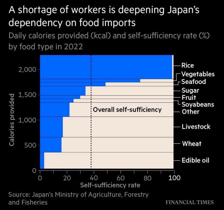 Καθώς ο ιαπωνικός πληθυσμός έχει συρρικνωθεί και γεράσει, οι ελλείψεις εργατικού δυναμικού στη γεωργία έχουν γίνει τρομερές. Τα κυβερνητικά στοιχεία δείχνουν ότι σε θερμιδικούς όρους η χώρα ήταν αυτάρκης για το 38 τοις εκατό των αναγκών της το 2022, έναντι ενός κυβερνητικού στόχου 45 τοις εκατό έως το 2030.