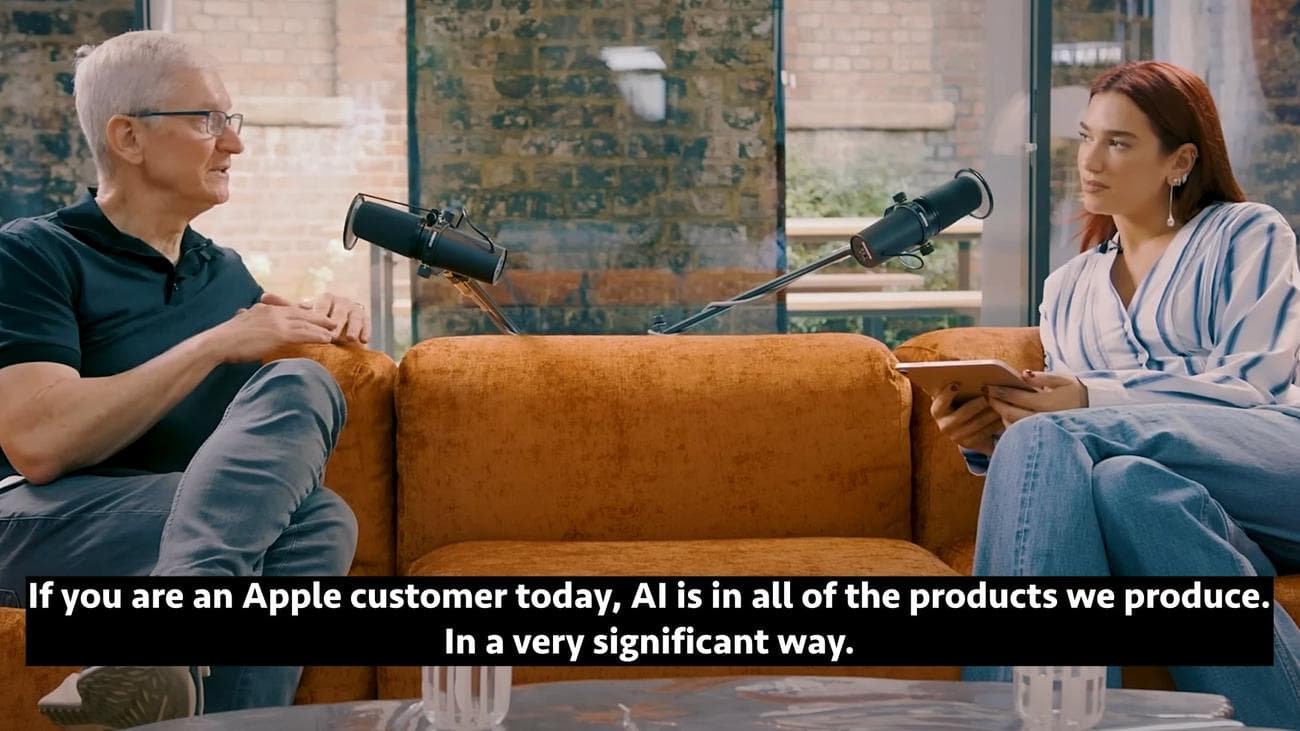 Για να ακούσετε τον Tim Cook και (από όλους τους ανθρώπους στον κόσμο) τη Dua Lipa να μιλάνε για την τεχνητή νοημοσύνη, μεταβείτε στο 27ο λεπτό της συνέντευξής τους (διαθέσιμη στο YouTube).