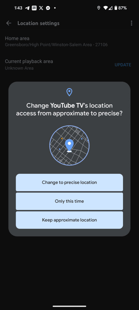 Παρόλο που υπάρχουν ορισμένες εφαρμογές Android που λειτουργούν πραγματικά όταν τους παρέχετε πρόσβαση στην τοποθεσία “Προσέγγιση”, η συντριπτική πλειονότητα των εφαρμογών αρνείται να λειτουργήσει εκτός εάν παραχωρήσετε “Ακριβή” δεδομένα τοποθεσίας. Προσωπικά, το έχω παρατηρήσει σχεδόν σε κάθε εφαρμογή που έχω προσπαθήσει να εκχωρήσω δικαιώματα “Προσέγγισης”. Η εφαρμογή είτε επιστρέφει με ένα μήνυμα σφάλματος που απαιτεί πρόσβαση “Ακριβής” ή ενεργεί σαν να μην της έδωσα καμία πρόσβαση στην τοποθεσία. Η εφαρμογή Allergy Plus της Pollen.com κάνει ακριβώς αυτό. Οι εφαρμογές της Google ευθύνονται και για αυτό, όπως το YouTube TV. Η ενσωματωμένη εφαρμογή